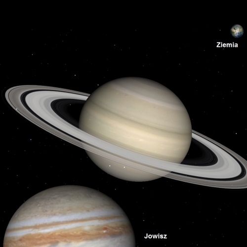 | Posiada 47 księżyców. W jego środku panuje temperatura ok. 12000 K, a sam Saturn oddaje więcej energii niż otrzymuje ze Słońca. Posiada pierścienie, złożone z pyłu i okruchów lodu. Rozciągają się na wysokości od 6630 do 120700 km nad powierzchnią planety. Powstały prawdopodobnie na skutek rozerwania przez siły pływowe jednego z księżyców albo na skutek kosmicznej kolizji księżyca z kometą czy asteroidą. Pierścienie są tworami nietrwałymi i za kilkanaście milionow lat znikną. Pierścienie poodzielane są od siebie szczelinami, "uprzątniętymi" przez niektóre z ksieżyców poruszających się tamtędy, bądź powstałymi dzięki oddziaływaniom grawitacyjnym większych ksiezyców. Na Saturnie wieją najszybsze w Ukłądzie Słonecznym wiatry - prędkość do 1800 km/h. | |