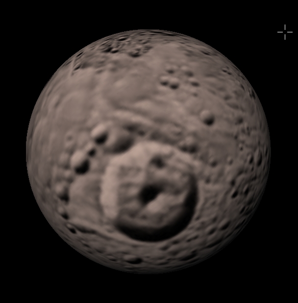 | Zbudowany głównie z lodu wodnego. Z powodu sił pływowych jego długość jest o 10% większa od szerokości. Charakterystyczny jest krater uderzeniowy o średnicy 130 km (krater Herschel'a). Mimas jest odpowiedzialny za "czyszczenie" z materii szczeliny Cassiniego pomiędzy pierścieniami A i B. | |