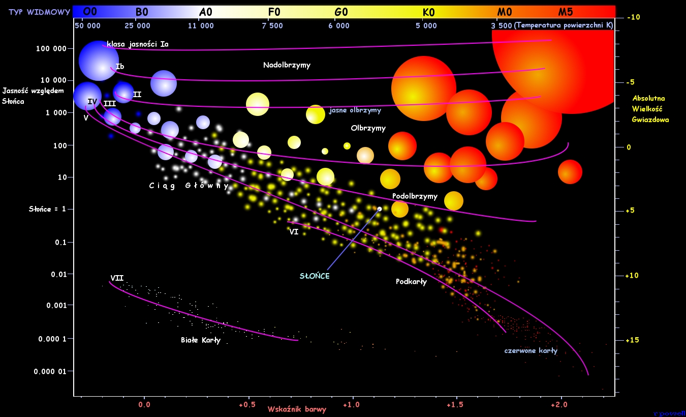 | AppMag | -26.7 < x < 30.0 | Wielkość gwiazdowa (Apparent Magnitude, m). Należy ją wyznaczyć z diagramu H-R, gdzie podana jest absolutna wielkość giwazdowa (M) dla gwiazdy danego typu. Aby przeliczyć M na m, należy zastosować wzór: m = M + 5 * log (d / 32,616), gdzie d - odległość w latach świetlnych | tak |