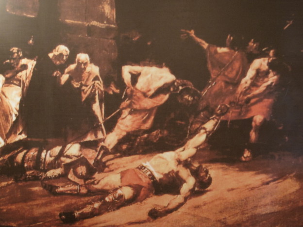 A teraz coś z Dalekiego Wschodu, a mianowicie obraz XIX-wiecznego filipińskiego malarza Juana Luny Spoliarium. Nie ma dobrej reprodukcji tego obrazu w Internecie, więc prezentuję najciekawszy pod względem makabryczności fragment. Spoliarium było pomieszczeniem w Koloseum, gdzie gromadzono ciała zabitych gladiatorów. Śmiertelnie ranny gladiator, albo taki, którego widzowie nie chcieli oszczędzić był dobijany ciosem wielkiego młota w głowę przez pomocnika przebranego za Charona. Ciała martwych były wywlekane ze sceny Bramą Śmierci do spoliarium, czyli po prostu do trupiarni. Wynoszono tam także ciała martwych zwierząt. W spoliarium gladiatorów rozbierano ze zbroi i zabierano im broń (recykling). Ciałami gladiatorów prawdopodobnie karmiono trzymane w Koloseum zwierzęta, ewentualnie grzebano je w zbiorowych mogiłach lub wrzucano do Tybru.