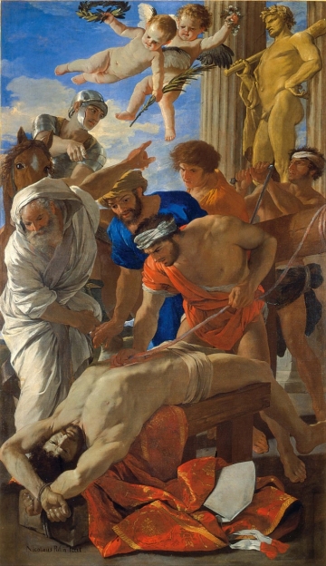 W przypadku bólu brzucha, warto pomodlić się do Świętego Erazma z Formii. Żył na przełomie III i IV w n.e. i był biskupem. W zasadzie to tyle, co o nim wiadomo. Znany jest bardziej z legend, niż ze swojej działalności chrystianizacyjnej. Podobno gdy głosił kazanie, strzelił obok niego piorun, ale on niezrażony kontynuował. Dlatego jest patronem żeglarzy, a wyładowania elektryczne na końcach masztów nazywane są na jego cześć "ogniami Świętego Elma" i uważano je za oznakę opieki świętego nad statkiem. Ale ciekawsze są jego atrybuty z którymi jest przedstawiany - są to wbite gwoździe pod paznokcie i korba, na którą ma nawleczone własne jelita - stąd ta modlitwa w przypadku niestrawności oraz patronowanie tokarzom. Męczeństwo Świętego Erazma uroczo zobrazował Nicolas Poussin - francuski malarz epoki baroku, chociaż mieszkał głównie w Rzymie. Specjalizował się w biblijnych i mitologicznych przedstawieniach, a jego obrazy cechuje spójny i zrozumiały układ. Dlatego był wzorem dla późniejszych francuskich malarzy epoki klasycyzmu.
