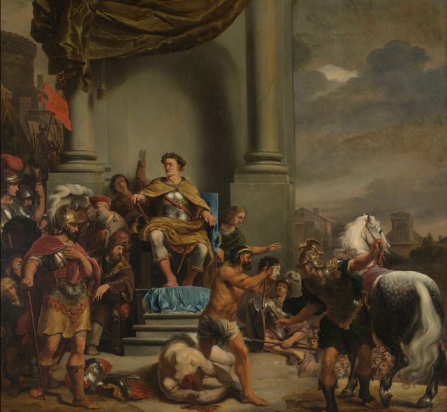 Oczywiście sam Tytus tyle nie żył, a okres jego rządów przypadał na pierwszą połowę IV w. p.n.e. Żeby było trudniej, w historii znanych jest jeszcze co najmniej trzech Tytusów Manliuszów Torkwatusów, potomków naszego Tytusa. Podczas wojny pomiędzy republiką rzymską a Związkiem Latyńskim, która wybuchła w 340 r. p.n.e., Torkwatus razem z drugim konsulem - Publiuszem Decjuszem Musem wprowadził bardzo surową dyscyplinę wojskową. Szereg uchybień było karanych śmiercią - m.in. opuszczenie posterunku czy wdawanie się w pojedynki z wrogiem. Traf chciał, że syn Tytusa Manliusza - też Tytus Manliusz (nazwijmy go "junior"), wraz ze swoim oddziałem natknął się na wroga. Wódz wrogiego oddziału wyzwał Tytusa juniora na pojedynek. Żądny chwały młodzieniec dał się sprowokować i pokonał zuchwalca. Gdy wrócił do ojca i pochwalił się tym czynem, Tytus Manliusz senior zebrał swoje wojska i oznajmił, że mimo iż kocha swego syna nad życie, nie może pozwolić na złamanie dyscypliny i skazał go na śmierć. Według kronikarza Tytusa Liwiusza, skazaniec został zatłuczony pałkami przez żołnierzy. Od tego zdarzenia pochodzi określenie "Manliuszowa dyscyplina" czy też "rządy manliańskie" oznaczające bezwzględną i surową władzę, a także bezgraniczne oddanie się służbie państwu. Powyższa historia dała asumpt flamandzkiemu malarzowi Ferdinandowi Bolowi do popełnienia obrazu "Konsul Tytus Manliusz Torkwatus skazujący swojego syna na ścięcie". Bol żył za czasów Rembrandta, a nawet pracował w jego warsztacie. Malował głównie pejzaże, portrety no i oczywiście sceny historyczne i religijne, jak to w baroku. Na obrazie widzimy, że Tytus junior został ścięty, a nie zatłuczony kijami, jak to opisał Tytus Liwiusz. Odarty z leżącej obok zbroi skazaniec leży bez ducha, a kat pokazuje jego obciętą głowę tłumowi żołnierzy czy też mieszkańców, ku przestrodze, że przestrzeganie prawa dotyczy każdego - nawet syna konsula. Zbolały ojciec odwraca głowę, jakby nie chciał patrzeć na reakcję przejętego grozą tłumu, udając niewzruszonego i surowego władcę czasu wojny. Motyw poświęcenia i oddania się sprawom państwowym przez Torkwatusa, obecnie nieco zapomniany, był popularny w malarstwie europejskim, zwłaszcza w okresie Rewolucji Francuskiej (neoklasycystyczne obrazy Jean-Simon Berthelemy'ego, Alphonse Gaudara de Laverdine'a czy Alexandre-Romain Honnet'a).