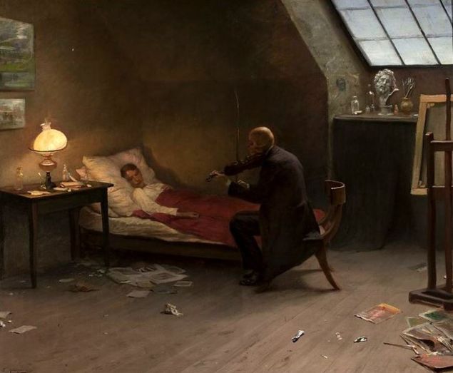 Płótno "Śmierć artysty - ostatni przyjaciel", trochę zapomnianego polskiego malarza Zygmunta Andrychiewicza, można zobaczyć w Muzeum Narodowym w Warszawie. Andrychiewicz był dobrze wykształconym artystą, wystawiającym w Zachęcie, podróżującym po Europie, ale najwidoczniej nie miał tej siły przebicia co Malczewski i obecnie znany jest tylko koneserom sztuki. Nieznane są okoliczności powstania tego obrazu. Andrychiewicz popełnił go w połowie swojego długiego życia (żył 82 lata, zmarł w 1943). Znany z portretów, malarstwa salonowego i pejzaży, tym razem zmierzył się z "vanitas vanitatum" oraz refleksją na temat tego, co po sobie zostawiamy, gdy śmierć przychodzi zagrać nam do wiecznego snu na skrzypcach. Raczej nie insporował się powieścią Uniłowskiego "Wspólny pokój", bo tę wydano w 1932, a obraz powstał w 1904. Być może to rezultat osobistych doświadczeń albo ogólnego ówczesnego nastroju fin de siecle. Tak czy inaczej - zajmuje miejsce w galerii makabresek. W roku 2021 obraz został wykorzystany w postpandemicznym projekcie "Malujcie tak aby Polska zmartwychwstała" gdzie w umierającego artystę wcielił się Organek.