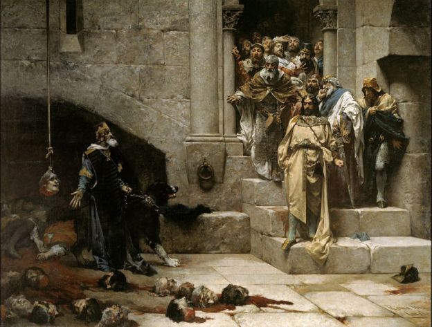 Hiszpański malarz Jose Casad del Alisal (1830 - 1886) odniósł sukces. Jako przedstawiciel akademizmu, dzięki swojemu talentowi, został z czasem dyrektorem Akademii Hiszpańskiej w Rzymie, a także członkiem królewskiej Akademii Sztuk Pięknych w Madrycie. Jednak prezentowany tutaj obraz spowodował jego rezygnację ze stanowiska dyrektora Akademii. Obraził się, bo jego makabreska nie zdobyła medalu na Krajowej Wystawie Sztuk Pięknych w 1881 roku. A tak się starał. Chodzi o obraz znany pod tytułem "Dzwon z Hueski". Jest to ilustracja hiszpańskiej legendy o dzwonie z Hueski. A w zasadzie legendy aragońskiej, bo dotyczy ona czasów rekonkwisty, a konkretnie XII wieku. Wtedy jeszcze Hiszpania nie istniała (pojawi się dopiero w 1469). Południowa część Półwyspu Iberyjskiego nadal znajdowała się w rękach Kalifatu Kordobańskiego pod panowaniem Almorawidów, a na północy istniały cztery katolickie królestwa - Leonu, Nawarry, Aragonii i Kastylii. No i oczywiście Królestwo Portugalii. W Polsce panuje wtedy Bolesław Krzywousty. Wracając do legendy - na tronie Aragoni zasiadł Ramiro II Mnich. Jest to czas licznych sojuszy, hołdów lennych, dziwacznych mariaży i makiaweliczych rozgrywek pomiędzy katolickimi królikami rzeczonych czterech królestw, a także władcami pomniejszych prowincji. Również Ramiro próbuje swoich sił, ale idzie mu z miernym skutkiem, przez co możnowładcy zaczynają sarkać. Ramiro wysyła posłańca do swojego dawnego mistrza, żyjącego w opactwie Saint-Pons-de Thomieres, aby ten mu doradził, co robić z hardymi aczkolwiek znaczącymi możnymi. Mistrz, jak to mistrz, nie rzekł ani słowa, lecz wziął posłańca do przyklasztornego ogrodu i pokazał, jak obrywa główki kilku różom, które odstawały od reszty równo rosnących kwiatów. Posłaniec przekazał królowi co widział. Ramiro długo nie czekał. Wezwał wszystkich szlachetnie urodzonych pod pozorem omówienia z nimi budowy dzwonu, który byłby słyszany w całej Aragonii. A gdy przybyli, obciął dwunastu z nim głowy, ułożył je w okrąg, a głowę głównego buntownika zawiesił na sznurze pośrodku. Taki to był dzwon z Hueski. A dlaczego z Hueski? Bo Hueska była wtedy stolicą Aragonii, gdzie rzekoma rzeź się odbyła. Na obrazie widać Ramiro, demonstrującego swój "dzwon" pozostałym buntownikom. Na ich twarzach widać rozmaite emocje - od rezygnacji, poprzez zgrozę, przerażenie, aż po niezdrowe zaciekawienie. Towarzyszy mu trzymany na łańcuchu mastif, gotowy rzucić się na zebranych.
