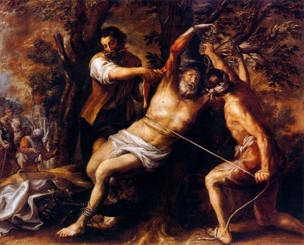 Święty Sebastian, jak powszechnie wiadomo, został naszpikowany strzałami niczym sienkiewiczowski Longinus Podbipięta, i tak też jest przedstawiany na dziesiątkach rozmaitych malowideł (El Greco, Rubens, Tycjan, Botticelli, Memling). Ale mało kto wie, że Sebastian przeżył owo naszpikowanie. Święta Irena razem ze swoją służącą usunęły strzały z Sebastiana i go wykurowały. Rozsądny człowiek, po takim doświadczeniu (przeżycie wykonania na sobie kary śmierci) zaszyłby się w najodleglejszej prowincji Rzymu, ale Sebastian prawdopodobnie był idiotą, ewentualnie jedna ze strzał uszkodziła mu istotę szarą. Poszedł zatem do cesarza Dioklecjana i zaczął mu robić wymówki, że ten źle traktuje chrześcijan, jak również jego - Sebastiana. Cesarz uśmiechnął się dziwnie, niczym reżyser Hochwander w "Misiu", gdy ponownie ujrzał Wesołego Romka, po czym kazał zatłuc Sebastiana pałkami, żeby tym razem nie było wątpliwości, że ów przeżyje, a ciało wrzucić do kanalizacji. Najwyraźniej większość malarzy skupiła się na pierwszej egzekucji Świętego Sebastiana. Widocznie strzały były bardziej malownicze niż ordynarne obrażenia od pałek. Ale jest chlubny wyjątek oto obraz włoskiego malarza okresu baroku Lodovico Carracciego pod wymownym tytułem Święty Sebastian wrzucany do Cloaca Maxima.