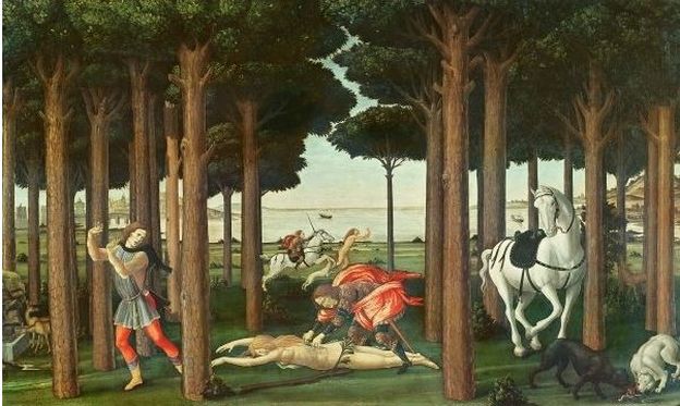 Sandro Botticelii (1445-1510), którego najbardziej znanym obrazem jest Narodziny Wenus, ma na swoim koncie ciekawą makabreskę tetraptyk stanowiący ilustrację do jednego z opowiadań zawartych w Dekameronie. Chodzi o opowieść nr VIII z dnia 5. czyli "Okrutne łowy". Bohater opowieści, młody Nostagio, nieszczęśliwie zakochany w nieczułej i okrutnej kobiecie, wyjeżdża z miasta. Po drodze napotyka upiory. Jednym z nich jest naga i piękna kobieta, a drugim rycerz na czarno ubrany, który goni kobietę i szczuje ją psami. Nostagio staje w obronie kobiety, ale rycerz wyjaśnia mu, w czym rzecz. Kiedyś się w niej kochał, lecz ona odrzuciła jego miłość, doprowadzając go do samobójstwa. Wkrótce ona sama umarła, a po śmierci otrzymali taką pokutę - w każdy piątek ona zmartwychwstaje, on ją goni, przeszywa mieczem, rozcina jej bok sztyletem i wyrywa serce, które psom swym rzuca. I będzie się to powtarzać tyle razy, ile miesięcy ona nim gardziła. Co tu dużo opisywać, oto rzeczone arcydzieło, a dokładnie ta najciekawsza, druga część tetraptyku. A jakie były dalsze losy Nostagia i jego nieszczęśliwej miłości, to już proszę sobie doczytać.