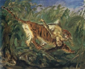 Max Slevogt (1868 1932) to niemiecki impresjonista, znany ze swoich pejzaży. Ale również ma na koncie makabreskę - obraz Tygrys w dżungli, przedstawiający tygrysa (zapewne w dżungli), niosącego swoją zdobycz nagą kobietę. W latach kiedy powstał, obraz uważano za mocno erotyczny, podobnie jak Szał Podkowińskiego. Mamy więc makabreskę i erotykę za jednym pociągnięciem pędzla.