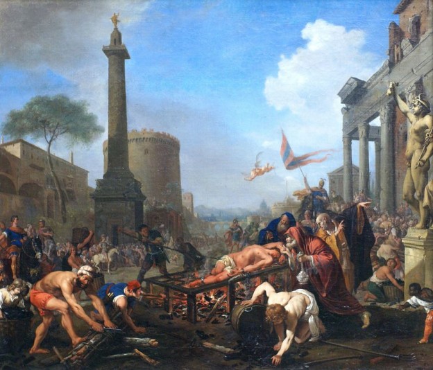 Święty Wawrzyniec (z angielskiego zwany Saint Lawrence lub Saint Laurent, co nie jest dziwne, jako, że wawrzyn to inaczej laur), miał pecha. Otóż żył w III w. naszej ery, w czasach, gdy cesarz rzymski Walerian I wydał edykt, na mocy którego wszyscy chrześcijańscy biskupi, księża i diakoni mieli być zabici, a ich majątki skonfiskowane. A Wawrzyniec był diakonem, czyli takim pomocnikiem duchownego. Co gorsza - zarządzał majątkiem wspólnoty religijnej, dlatego poproszono go, aby ujawnił, gdzie te dobra się znajdują. Aby rozwiązać mu język, postanowiono upiec go na ruszcie, a raczej kratownicy. I tak Wawrzyniec został świętym, a ruszt jego atrybutem. Gdyby Wawrzyniec urodził się 55 lat później, to doczekałby edyktu mediolańskiego, wydanego w 313 roku przez cesarza Konstantyna I Wielkiego, który ustanowił wolność wyznania wiary. A podły cesarz Walerian I doczekał się hańby - został jedynym w historii cesarzem rzymskim, który się dostał do niewoli, a co gorsza - służył perskiemu królowi Szapurowi jako podnóżek przy wsiadaniu na konia. Wracając do świeżo upieczonego (nomen omen) świętego - jego kaźń rozpaliła wyobraźnię wielu malarzy - byli to między innymi Tintoretto, Giovane, Tycjan, Rubens, Rioja, Bronzino czy Breenbergh. Wybrałem Męczeństwo Świętego Wawrzyńca Bartholomeusa Breenbergha - - holenderskiego malarza z przełomu wieków XVI i XVII. Jego rumiany Walerian jest urzekający. Nie powinno dziwić, że Święty Wawrzyniec jest patronem kucharzy, piekarzy, a także ma chronić przed poparzeniami. Ciekawostka - na planie kratownicy został zbudowany Eskurial. Ciekawostka nr dwa - żeńska wersja imienia Wawrzyniec to... Laura. Jeśli chodzi o tę metodę egzekucji była raczej mało popularna. Znane są jednak jej warianty, takie jak byk z brązu, w którym na starożytnej Sycylii pieczono skazańców, upieczenie na żelaznym tronie Jerzego Doży - przywódcy powstania chłopskiego w XVI wieku na Węgrzech, smażenie na rożnie chciwych restauratorów podczas głodu w XVII wieku w Persji, pieczenie żywcem jeńców wojennych podczas wojen plemiennych na Fidżi w XIX wieku czy powolne palenie żywcem SS-manów w piecach kremacyjnych przez oswobodzonych więźniów (np. w obozie w Ebensee).